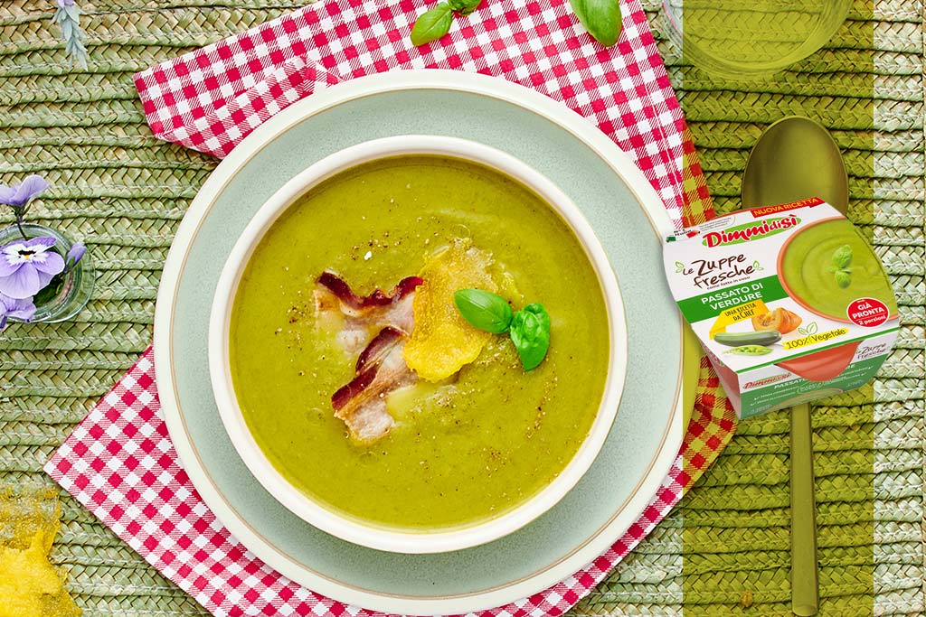 Fate arrostire le fette di pancetta affumicata in una padella antiaderente senza grassi fino a quando saranno diventate croccanti. Tagliatele poi a metà o in piccoli segmenti. Scaldate il Passato di verdure DimmidiSì, quindi servitelo nei piatti da portata con la pancetta affumicata, il timo e le cialdine di polenta.