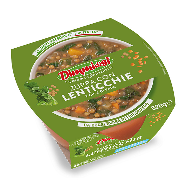 acqua, lenticchie verdi e rosse 16%, zucca, cime di rapa 4%, cipolla, carota, sedano, olio extravergine di oliva, doppio concentrato di pomodoro, sale, pianta aromatica, spezia.